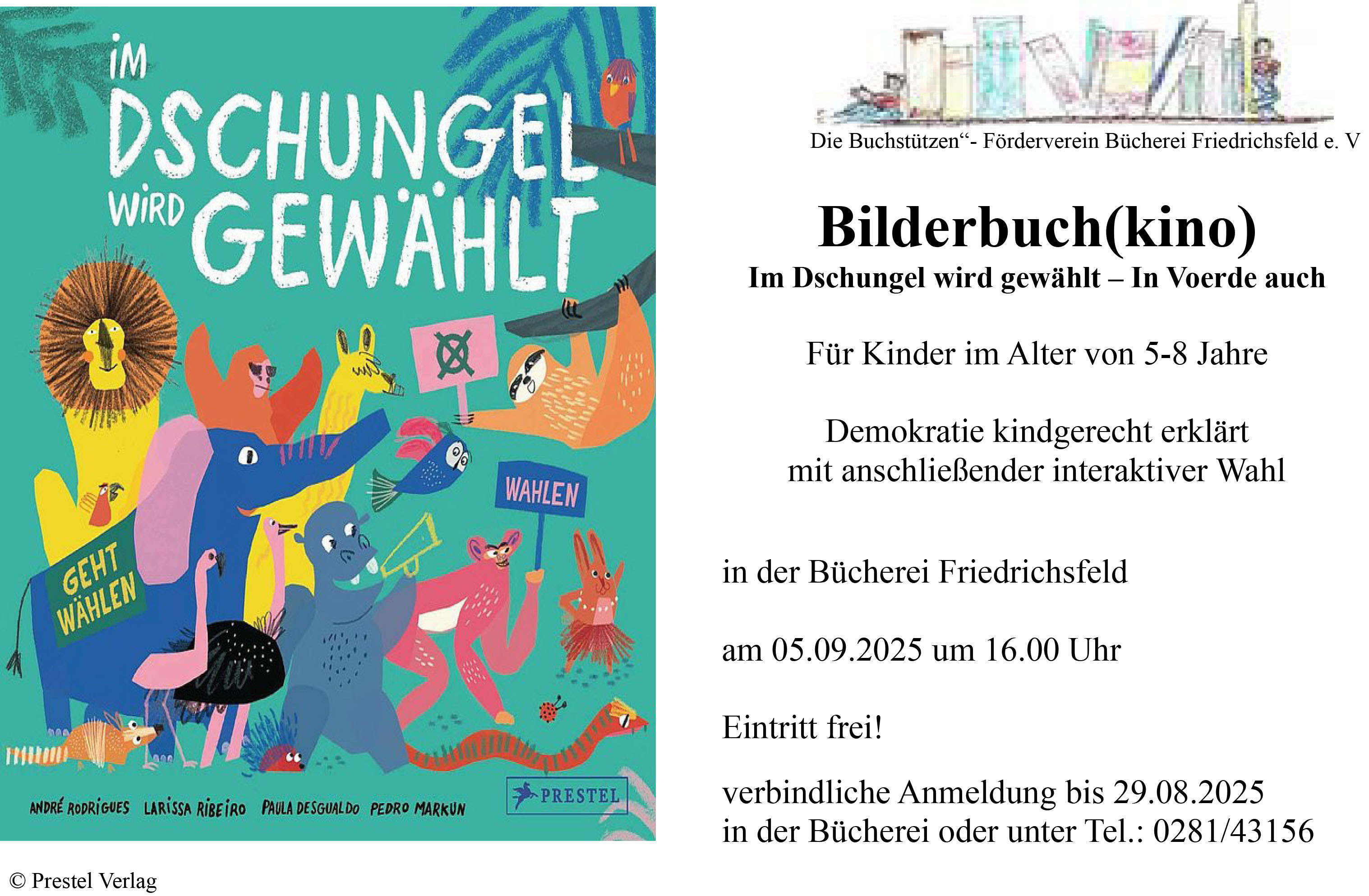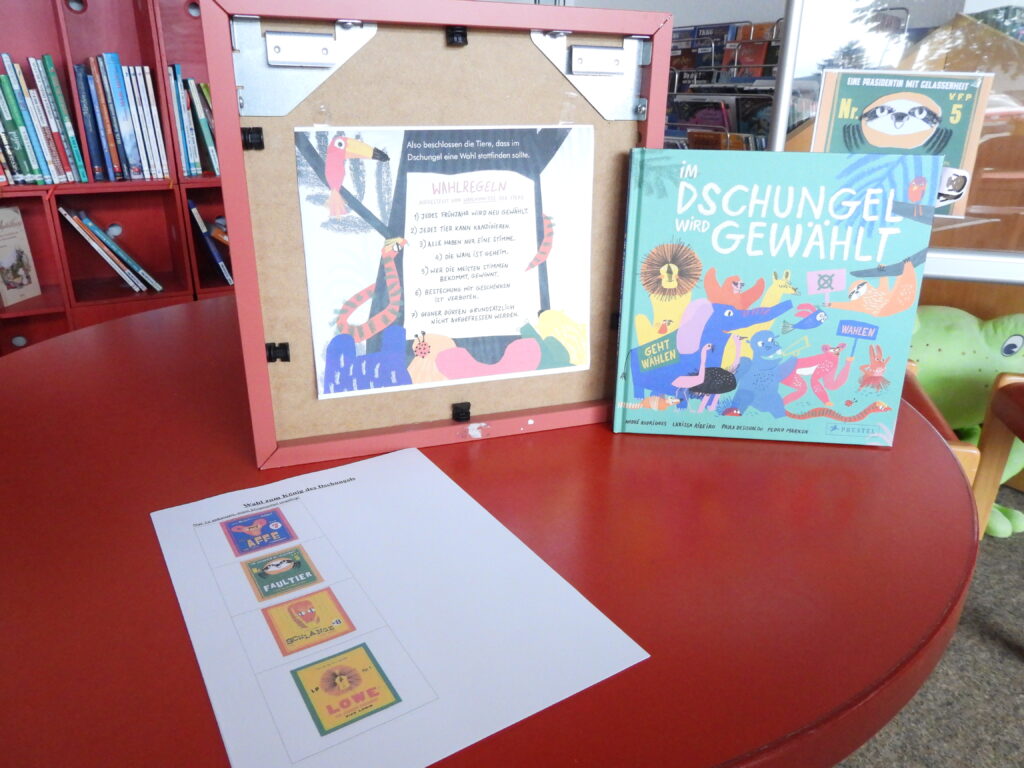 Der Löwe mag zwar der König des Dschungels sein, momentan denkt er aber nur an sich selbst. Seine Untertanen haben die Schnauze voll und fordern in lautem Protest eine Wahl der Tiere. Wer wird gewinnen? Die preisgekrönte Fabel von Larissa Ribeiro wurde mit Kindern für Kinder geschrieben. Im kleinen Kreis erhielten die Kinder beim „Bilderbuchkino“einen kindgerechten Einblick in Politik, Demokratie und unser Wahlsystem. Perfekt zu den anstehenden Wahlen am 14.9.! An diesem Nachmittag führten die Kinder selbst eine geheime Wahl mit bestehenden Wahlplakaten, Wahlzetteln, Wahlkabine,Wahlurne… durch. Anwesende Eltern durften sich als Wahlhelfer beteiligen, zur Wahl wurden sie aber von den Kindern einstimmig nicht zugelassen. In Friedrichsfeld wäre nun eine Stichwahl nötig gewesen, denn Schlange und Löwe erhielten gleiche Stimmanzahl.